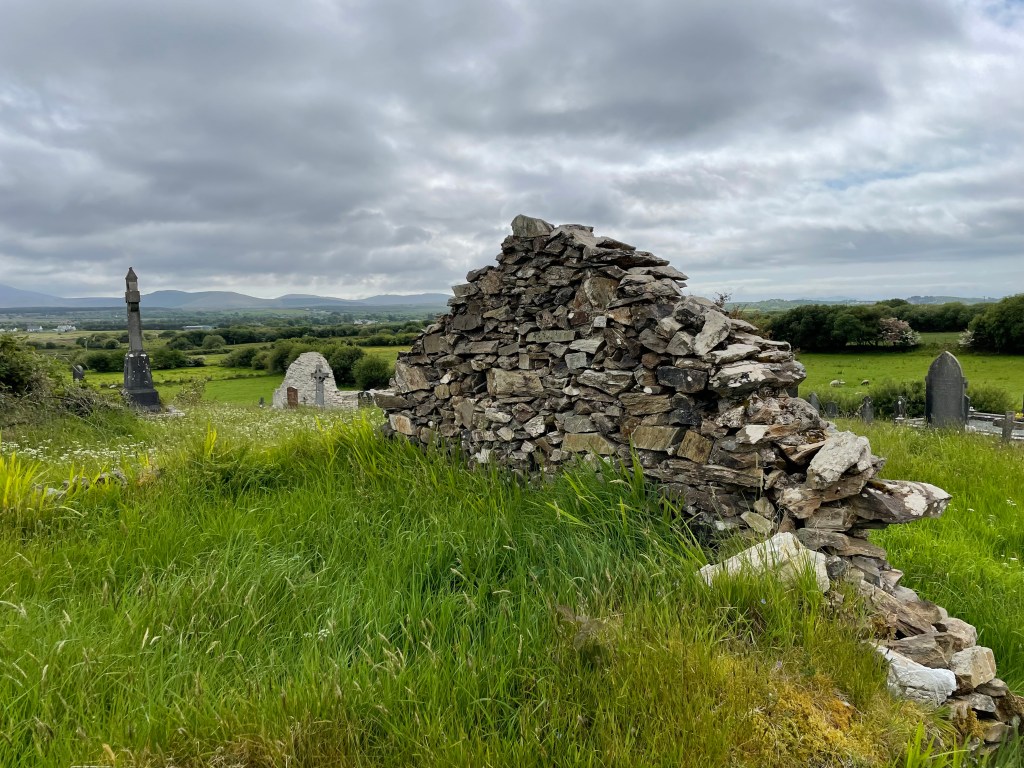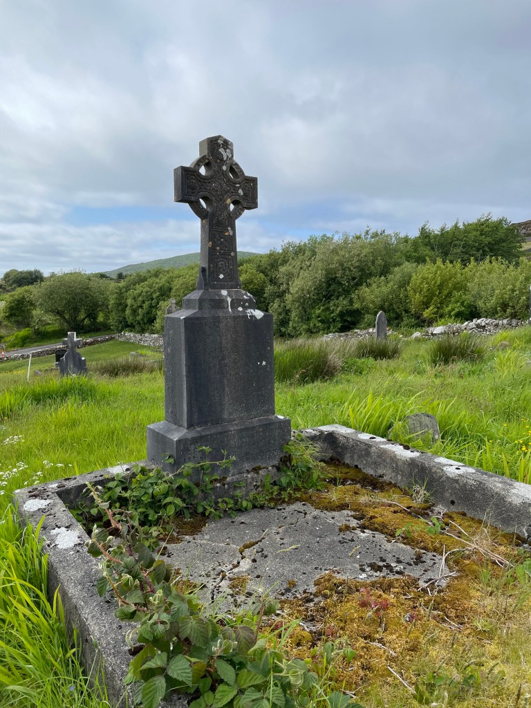 Kilgeever Cemetery in Louisburgh where my ancestors are lying. Tried to find family graves, but we were unsuccessful. Did meet an Irish man saying his prayers around the holy well at the cemetery. He tried to help us find our ancestors.